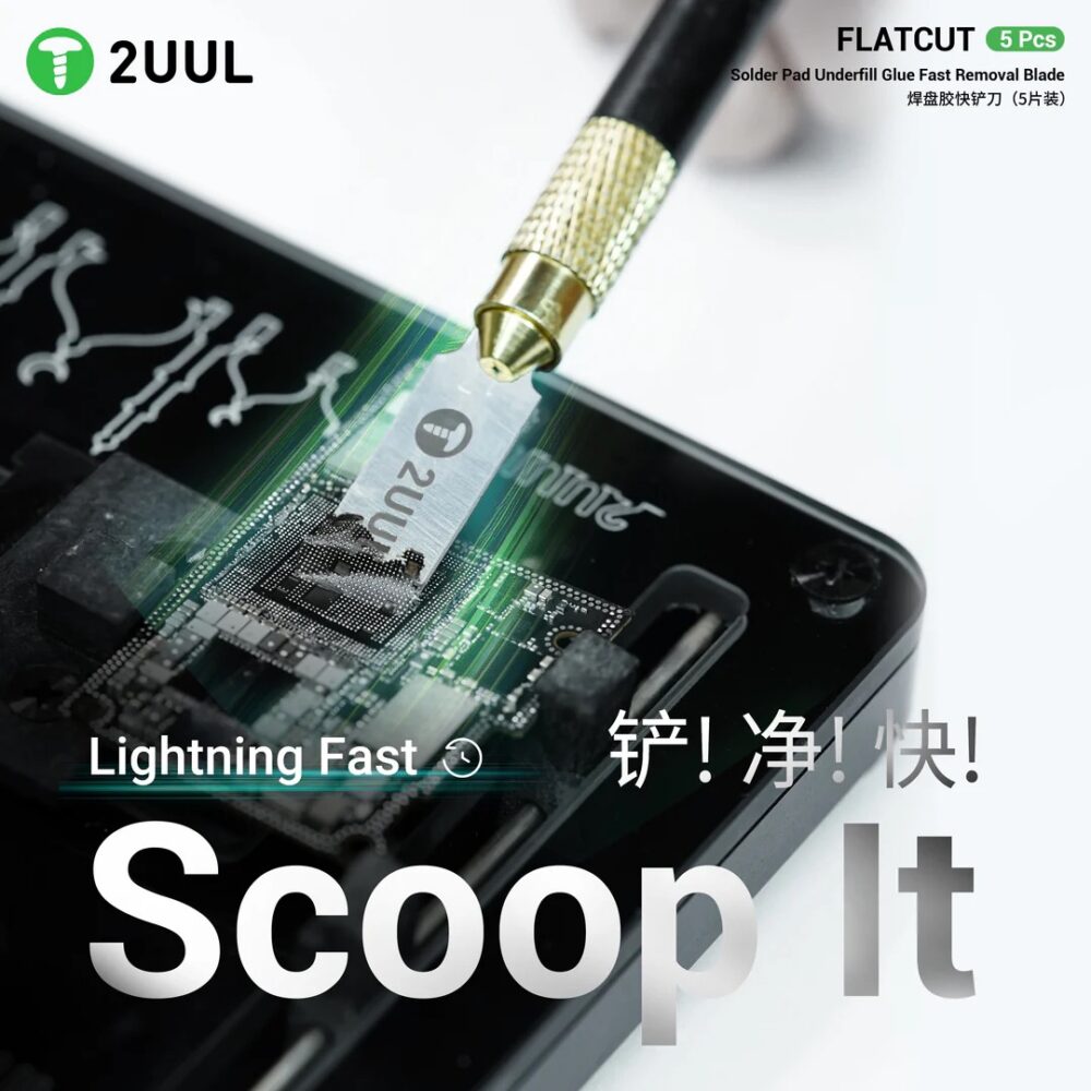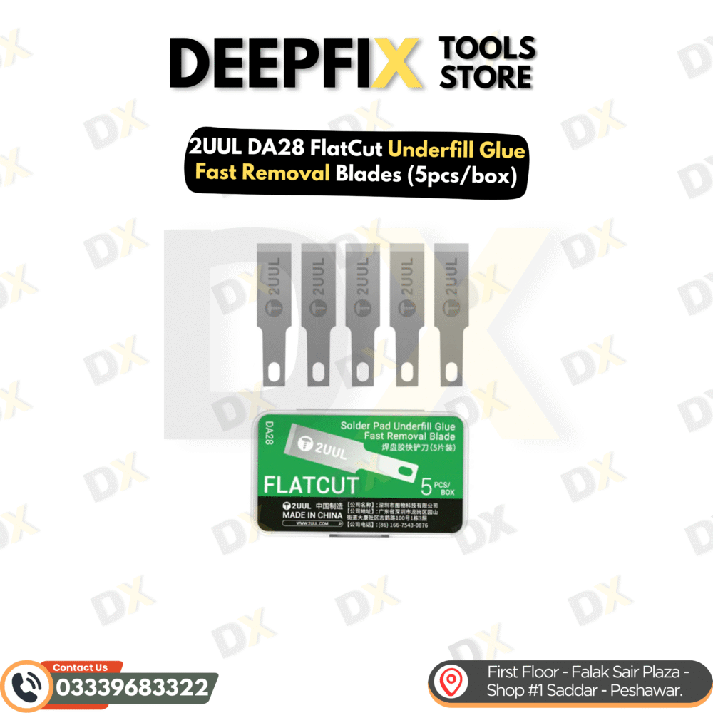 The 2UUL DA28 FlatCut Underfill Glue Removal Blade Set is a specialized precision tool designed for fast and controlled removal of underfill glue and solder pad adhesive during advanced mobile phone and electronics repair. Featuring a flat-cut blade profile, this set allows technicians to work closely along solder pads and IC edges without damaging the PCB surface.