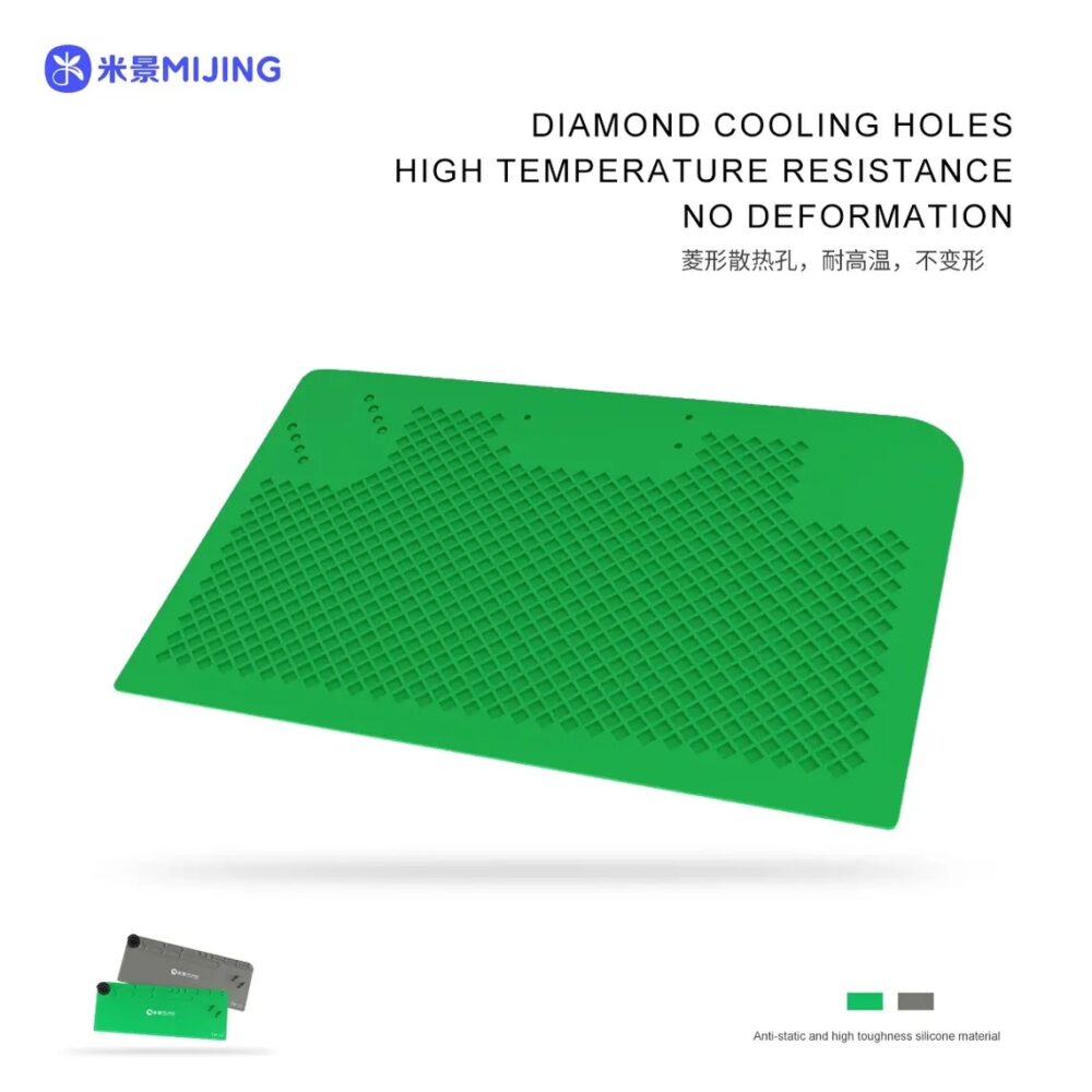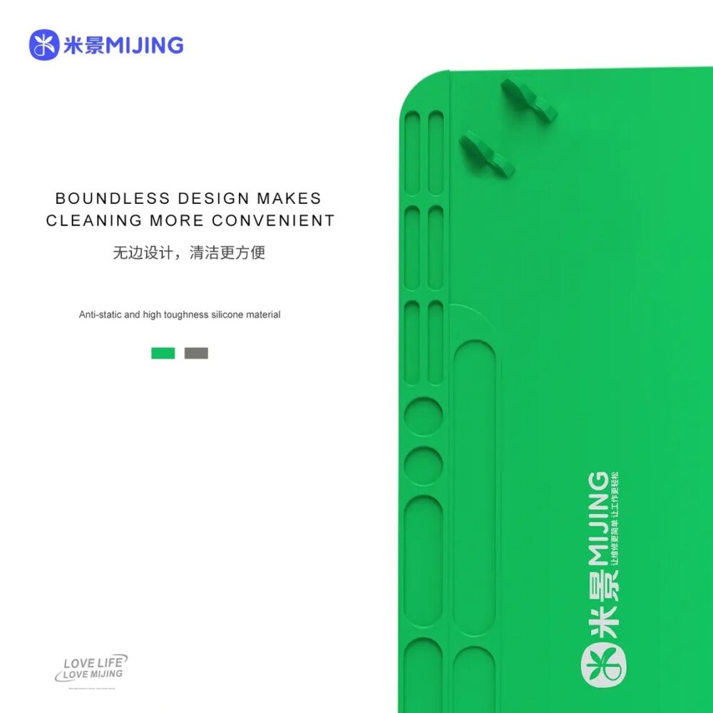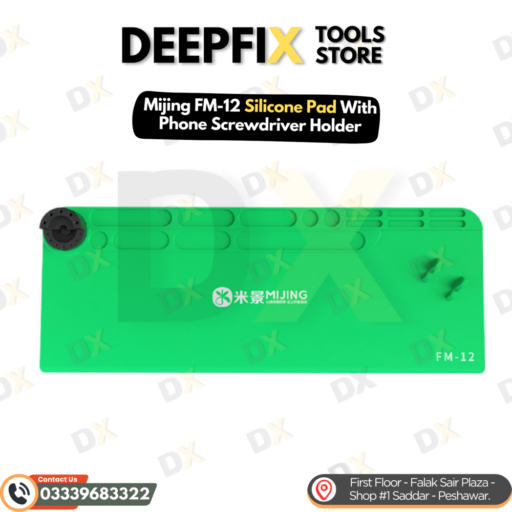 The MiJing FM-12 Large Silicone Repair Mat is a high-quality professional workstation mat designed to protect and organize your repair bench while working on mobile phones, tablets, and circuit boards. Made from anti-static, high-toughness silicone, this mat provides excellent heat resistance and durability, creating a stable and safe surface for soldering, component removal, and general electronics repair.