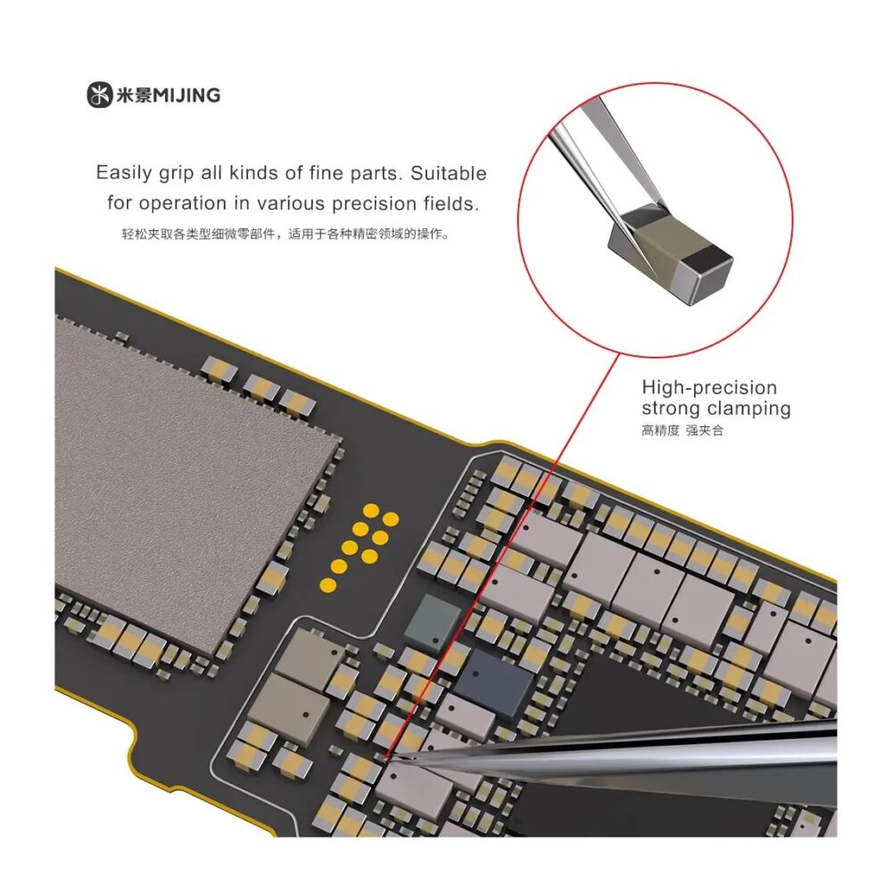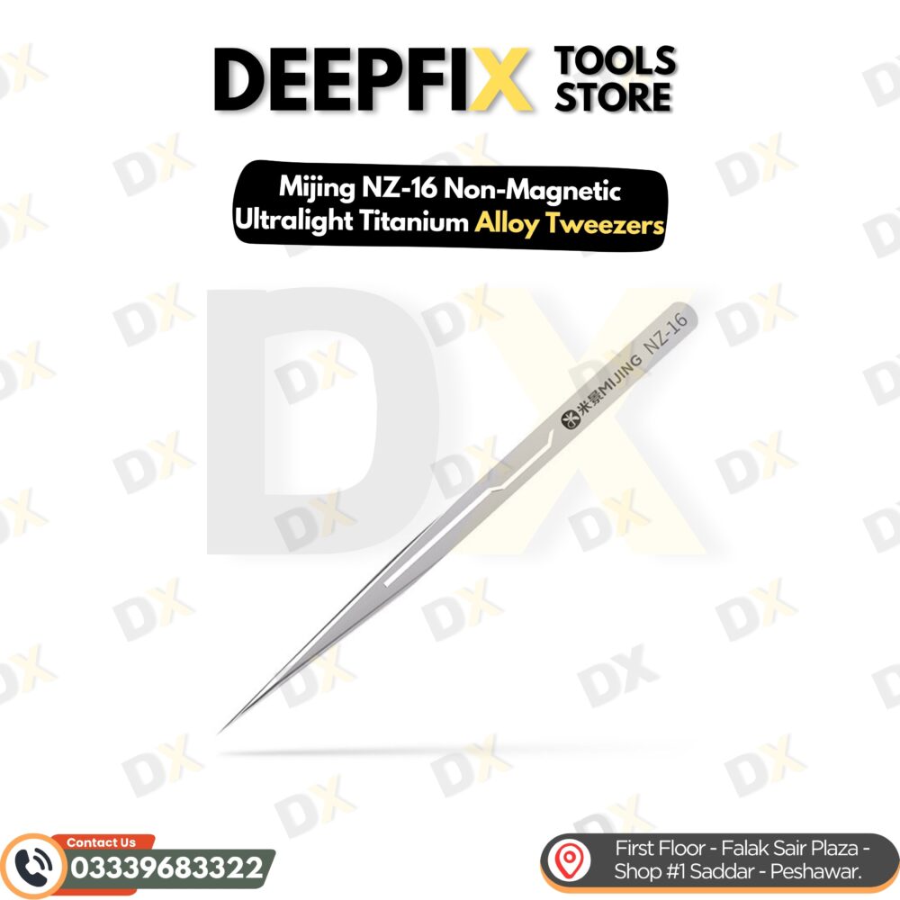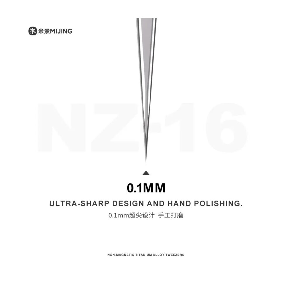 The MiJing NZ-16 Non-Magnetic Ultralight Precision Tweezers are professional-grade hand tools designed for ultra-fine handling and manipulation of electronic components during mobile phone, tablet, and precision electronics repair. Crafted from high-quality titanium alloy with a 0.1 mm ultra-sharp tip and hand-polished finish, these tweezers deliver exceptional precision, rigidity, and durability for board-level work.
